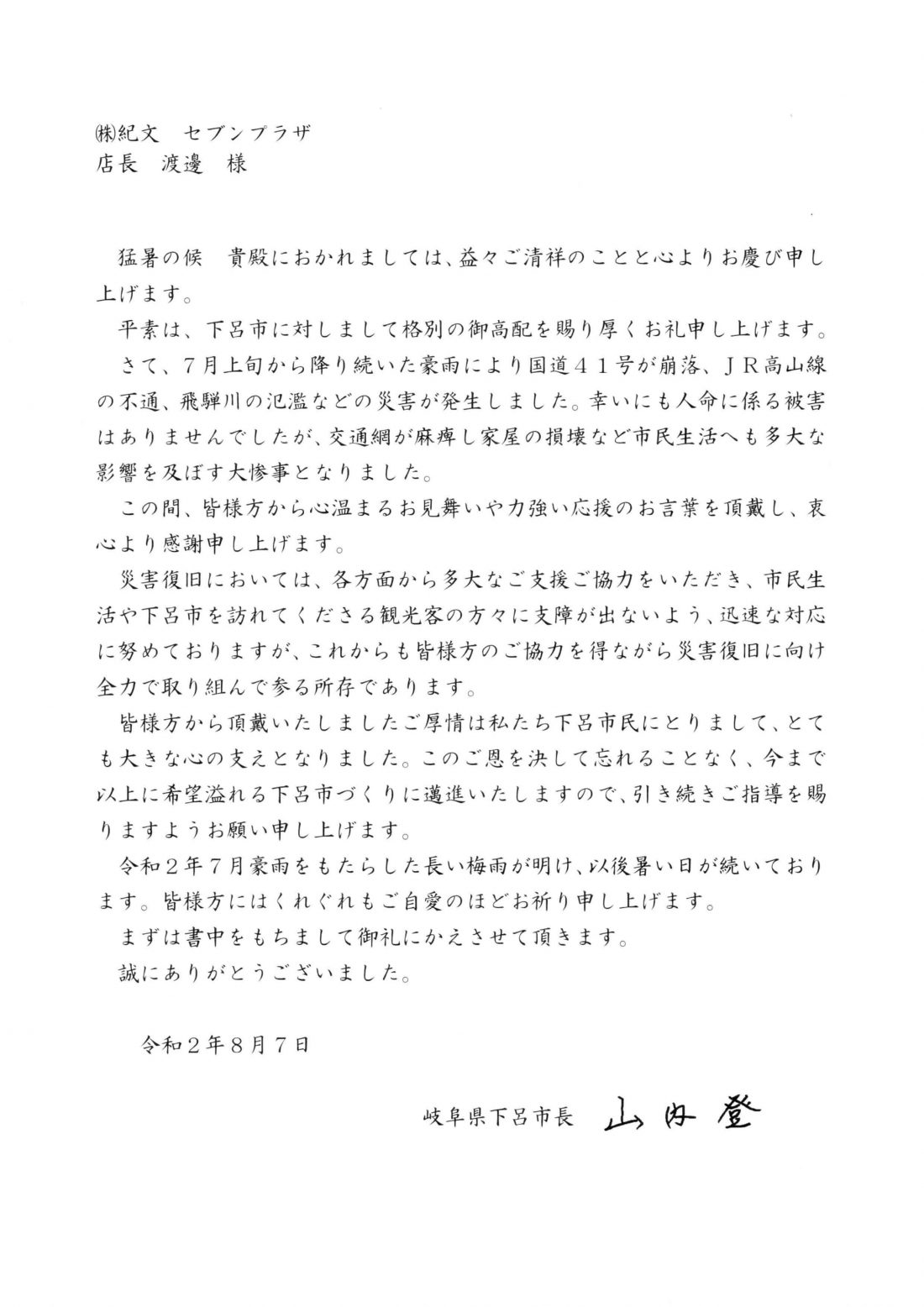 下呂市長様よりお礼状が届きました 以前お知らせ致しました、避難所へのお菓子の寄付の続報です。 被災された皆様へお見舞い申し上げます。 皆様に代わりましてお持ちしましたお菓子のお礼状が下呂市長様から届きました。 私たち紀文グループの活動にご協力頂きました皆様へ感謝の気持ちと、ご報告になります。 お知らせ一覧に戻る>>