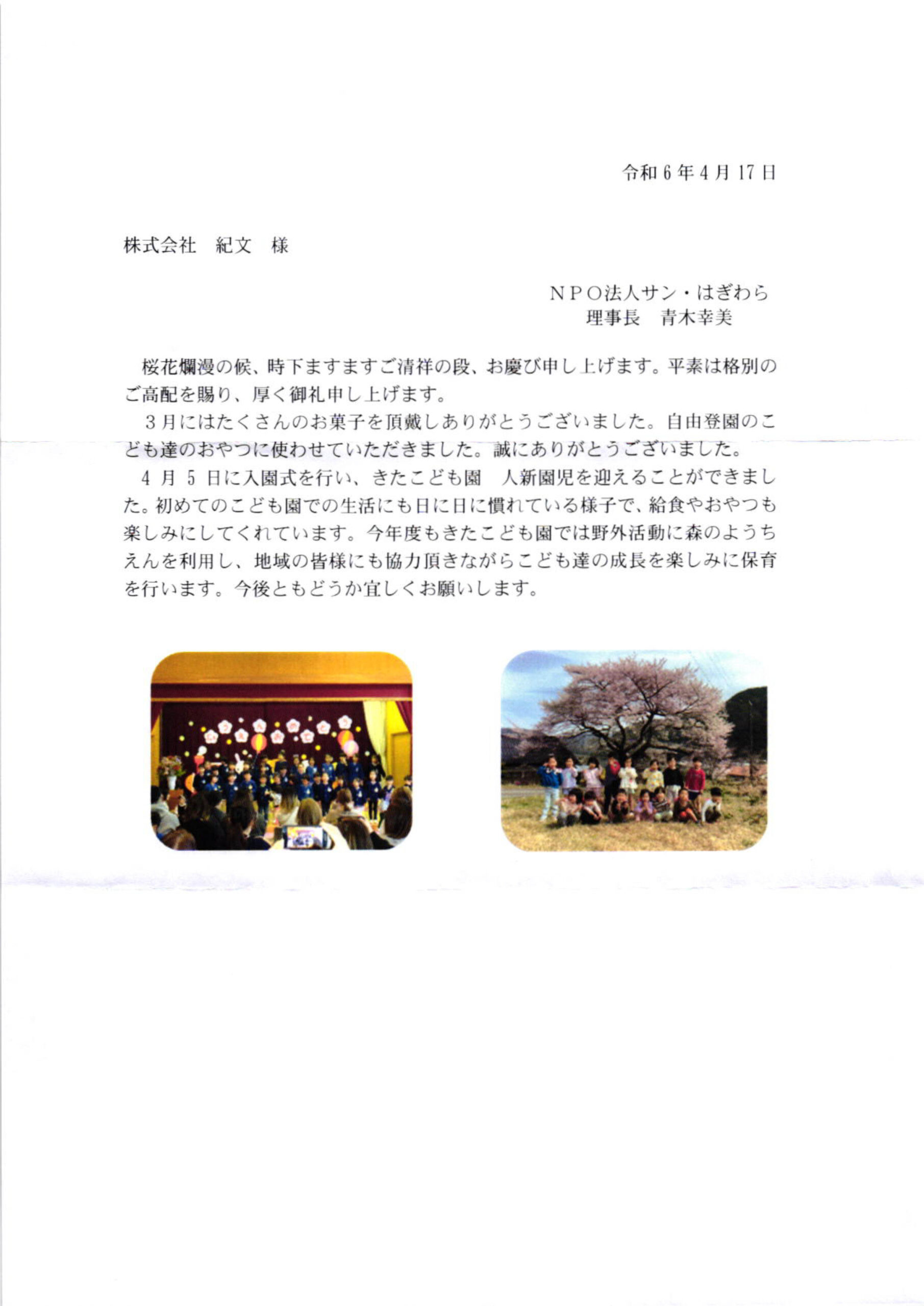 お菓子の寄付へのお礼状を頂きました 先日、2回目となります、皆さまから頂きましたお菓子の寄付を 『萩原北こども園様』 へ、お届けいたしました! 後日、NPO法人 サン・はぎわら 代表 青木様より お礼状を頂きましたので、ホームページでお知らせさせて頂きます。 皆さまのご厚意が、お子さんたちの笑顔に繋がりました! 弊社の活動にご協力頂き、感謝の言葉とさせて頂きます。 今後も活動を続けていきますので、ご協力を宜しくお願い致します。 お知らせ一覧に戻る>>