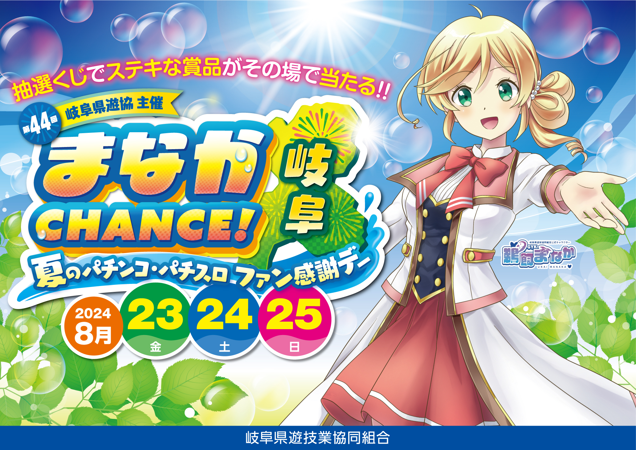 岐阜県遊技業組合主催【まなかCHANCE!】のお知らせ 8月23日(金)~25日(日)の3日間 岐阜県遊技業組合主催 【まなかCANCE!】 開催のお知らせです。 今回もKIBUNGROUP 4店舗が参加致します! 豪華賞品が当たるかも!?クジ引き開催です。 ※くじ引きの時間は各店にお問い合わせください。 皆さまのご来店をお待ちしていま~す(*^^)v お知らせ一覧に戻る>>
